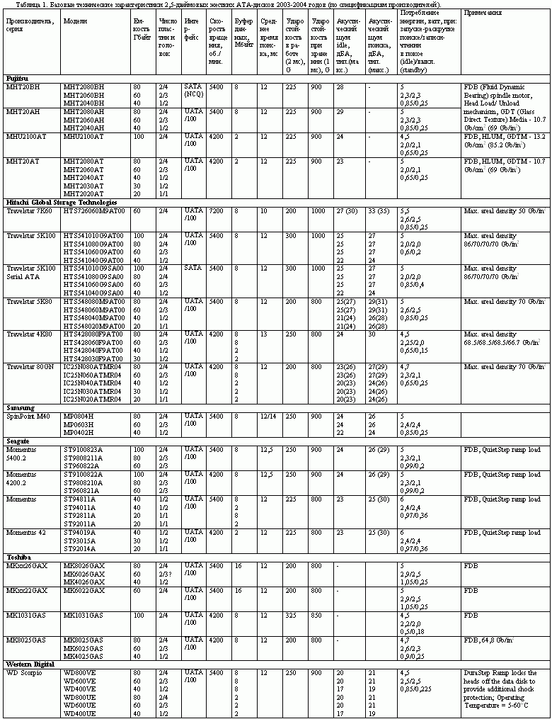 Модельные ряды 2,5-дюймовых винчестеров этих компаний заметно различаются. Базовые технические характеристики современных и недавнего прошлого 2,5-дюймовых жестких дисков представлены в сводной таблице 1 (она основана на спецификациях производителей).