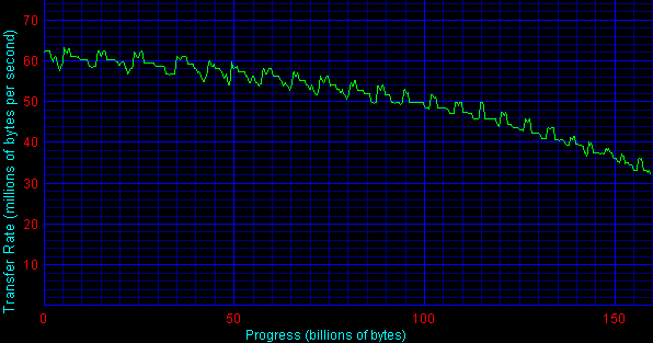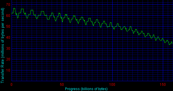 Вообще говоря, «эластичная BPI» (Bits per inch, линейная плотность записи), о которой я писал в самом первом обзоре диска SP1604N, допускает, по видимому, некоторый разброс характеристик между экземплярами, но разрыв не столь существенен. Но ориентиры есть — на диаграмме.