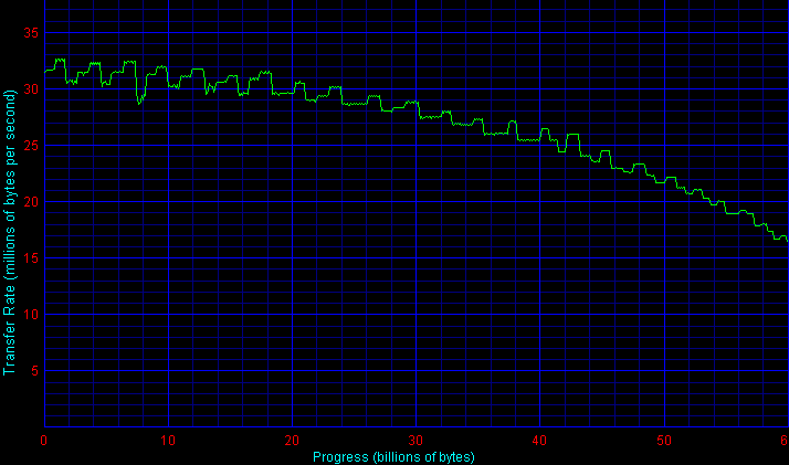 По максимальной (усредненной за несколько «периодов» в начале диска), средней и минимальной скорости чтения данных с пластины диски расположились в следующем порядке: