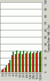 По результатам этого теста можно констатировать, что у Samsung этой серии отличная оптимизация firmware для работы с блоками малого размера — скорость на блоках 512, 1024 и 2048 байт для этих дисков одна из самых высоких среди конкурентов. Вместе с тем, кэширование файлов объемом 1 Мбайт и выше у дисков Samsung не такое эффективное, как у Seagate и Hitachi. Если Momentus отлично кэширует на запись даже файлы объемом 1 и 4 Мбайт (скорость их записи по тесту фактически равна скорости ATA-интерфейса), а Hitachi мегабайтные файлы хорошо кэширует и на запись, и на чтение (и даже 4-мегабайтные на чтение!), то Samsung при чтении 1- и 4-мегабайтных файлов работает фактически со скоростью физического носителя. Хотя при записи 1- и 4-мегабайтных файлов кэширование и у Samsung M40 весьма эффективное (примерно как у Seagate Momentus ). Интересно и другое — оказывается, что firmware у средней модели MP0603H работает чуть лучше, чем у двух других: на мегабайтном файле у этой модели явно лучше чтение большими блоками, а на 8-32-мегабайтных файлах именно эта модель радует отменной «чистотой» скорости записи, чего не скажешь о ее собратьях. Если учесть, что результаты этого теста для диска MP0603H в обычном и тихом режиме поиска практически идентичны, то получается явный «преферанс» в ее сторону!