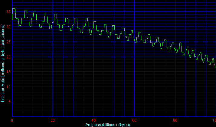 При имитации чтения и записи крупных файлов (типа mp3, видео, больших фотографий и пр.) диск на 100 Гбайт от Samsung кардинально (на 55%!) ускорил запись и немного замедлил чтение по сравнению с Samsung M40. В результате в среднем он опередил здесь старший диск M40 на 20%, хотя и уступил лидерам от Seagate, Hitachi и Toshiba.