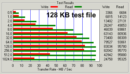 Другим показательным тестом «внутреннего устройства» дисков является тест на скорость чтения и записи файлов различного объема блоками разного размера — от 512 байт до 1 Мбайт. Для этого я традиционно использую тест ATTO Disk Benchmark. На скриншотах ниже показаны результаты для четырех размеров тестового файла — 128 Кбайт, 1 Мбайт, 4 Мбайт и 32 Мбайт. Если первый и второй, как правило, гарантированно кэшируются буфером диска (причем, кэширование записи и чтения для мегабайтного файла не так однозначно), то последний просто в него «не влезает», а кэширование предпоследнего зависит не только от объема буфера, но и от специфики работы firmware накопителя (кстати, результаты данного теста практически не зависят от выбора между FAT и NTFS).