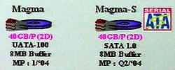 Первая серия мобильных жестких дисков Samsung, которая поникла на рынок в середине этого года, имеет кодовое имя Magma и официальное название — SpinPoint M40. Диски этой серии имеют скорость вращения шпинделя 5400 об./мин. (диски со скоростью 4200 об./мин. компанией выпускаться не будут вовсе), объем 30, 40, 60 и 80 Гбайт (все модели основаны на технологии 40-гигабайтных пластин; отсюда и появилась цифра в названии серии), буфер 8 Мбайт, среднее время поиска 12 и 14 мс при чтении и записи соответственно и интерфейс UltraATA /100 или SerialATA (последние носят название Magma-S).