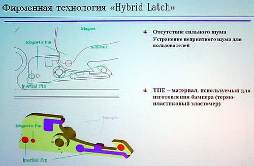 В целом, они напоминают вышедшие примерно год назад накопители Seagate Momentus. Ударостойкость SpinPoint M находится на уровне 250g в работе и до 900g в обесточенном состоянии — и это даже немного лучше, чем в среднем у конкурентов, поскольку серия SpinPoint M проектировалась именно с расчетом на повышенную надежность — механическая платформа и прочный кожух разработаны так, чтобы минимизировать силу внешних воздействий, приходящихся на самые важные части накопителя. Дополняют эти характеристики невысокий уровень акустического шума — 22-24 дБА при вращении и 24-26 дБА при поиске (также слегка лучше, чем у основных соперников), причем новый прогрессивный механизм «защелки» (технология Hybrid Latch, см. слайд), разработанный инженерами компании, устраняет не только традиционный неприятный «рабочий» шум (idle), но также в значительной степени снижает треск в режиме поиска (в зависимости от заданного режима работы).