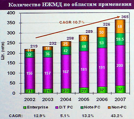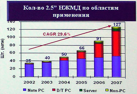 Поэтому следующим вполне логичным шагом для компании, выпускающей к тому же великолепные ноутбуки, было наладить выпуск собственных «ноутбучных» винчестеров. Этому способствует и то, что рынок ноутбуков сейчас является одним из самых быстрорастущих, а объем рынка накопителей для ноутбуков в 2007 году оценивается в 127 млн. штук (и составит почти половину от всех выпускаемых винчестеров в денежном выражении), тогда как в 2003 году он составлял лишь 36 млн. (см. слайд),