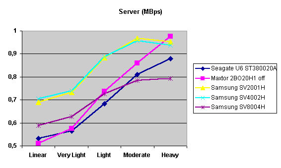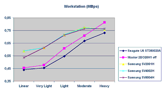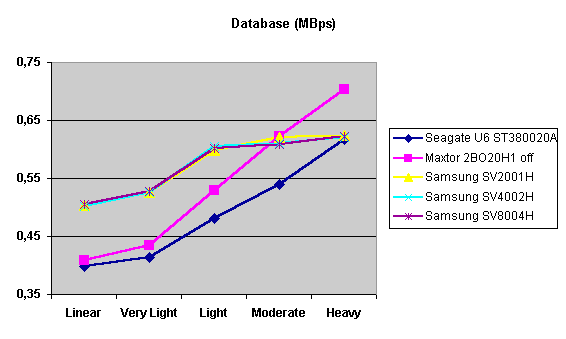 А вот здесь диск емкостью 80 гигабайт существенно отстает. Видимо, дело в том, что данная модель доступа подразумевает работу с блоками данных разного размера, что заставляет firmware диска больше думать, а если еще учесть, что чтение/запись производится на случайно выбранное место, большой объем (или две пластины) приводит к замедлению работы. Однопластинные же диски лидируют практически всю дорогу — сказывается минимальное время доступа, — но при максимальной нагрузке все-таки уступают Maxtor.