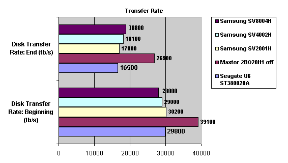 Как видно на графиках, максимальная скорость чтения у всех дисков практически одинаковая — те самые 30 с небольшим тысяч байт в секунду, вот только достигается она не всегда в начале диска. Интересный эффект. Ни у Maxtor 541DX, ни у Seagate U6 такого не наблюдается. Также обращает на себя внимание рост скорости чтения в конце диска при росте объема. В чем тут причина — не могу сказать. В общем и целом — Maxtor остался недосягаем, а с Seagate U6 примерный паритет.