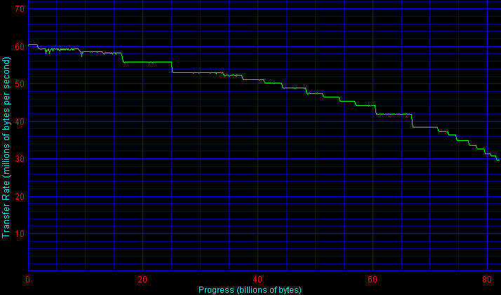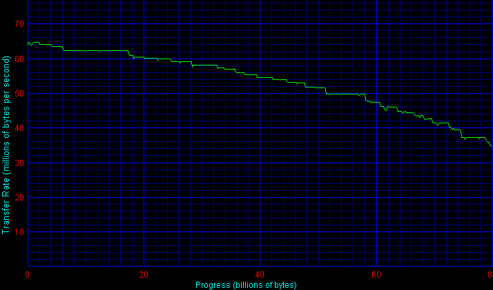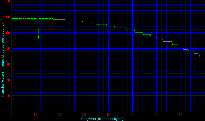 При анализе графиков для дисков Samsung прежде всего обращает на себя внимание изменение подхода к адаптивному форматированию. Если раньше (у исходных 80-гигабайтных пластин Samsung) наблюдались ступени с разной плотностью, периодически изменяющиеся по мере роста номера зоны, то у HD080HJ мы видим гладкий график с традиционными ступеням зон. Впрочем, судя по анализу последних дисков Samsung большей плотности, адаптивное форматирование присутствует и здесь, просто в усовершенствованном виде, с адаптивной границей зон и более «интеллектуальным» транслятором логических адресов, позволяющим сгладить неровности графика.