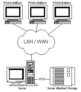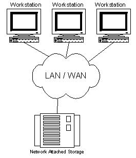 Сторедж-система, подсоединенная к сети. Этот вариант организации доступа появился сравнительно недавно. Основным его преимуществом является удобство интеграции дополнительной системы хранения данных в существующие сети, но сам по себе он не привносит сколь-нибудь радикальных улучшений в архитектуру сторедж. Фактически NAS есть чистый файл-сервер, и сегодня можно встретить немало новых реализаций сторедж типа NAS на основе технологии тонкого сервера (Thin Server).