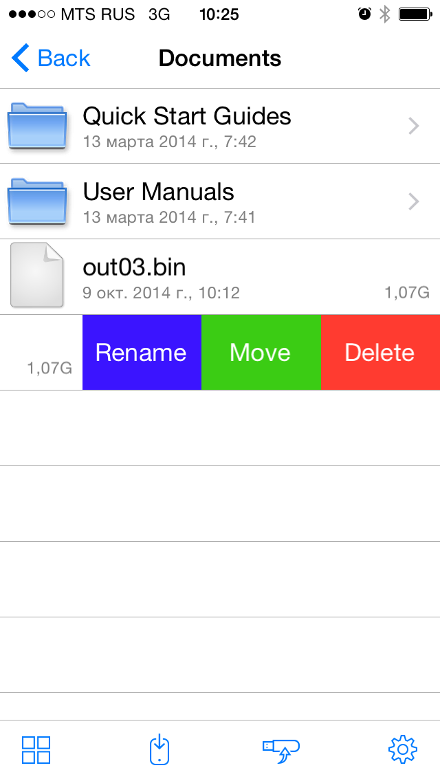 В программе реализованы возможности по перемещению, переименованию и удалению файлов и директорий на устройстве, а также созданию новых папок. Предусмотрены загрузка файлов с беспроводного накопителя в смартфон или планшет (в локальное хранилище программы), а также выгрузка с мобильного устройства документов, фотографий и видео на накопитель. Некоторым недостатком стоит считать невозможность загрузки и скачивания директорий целиком.