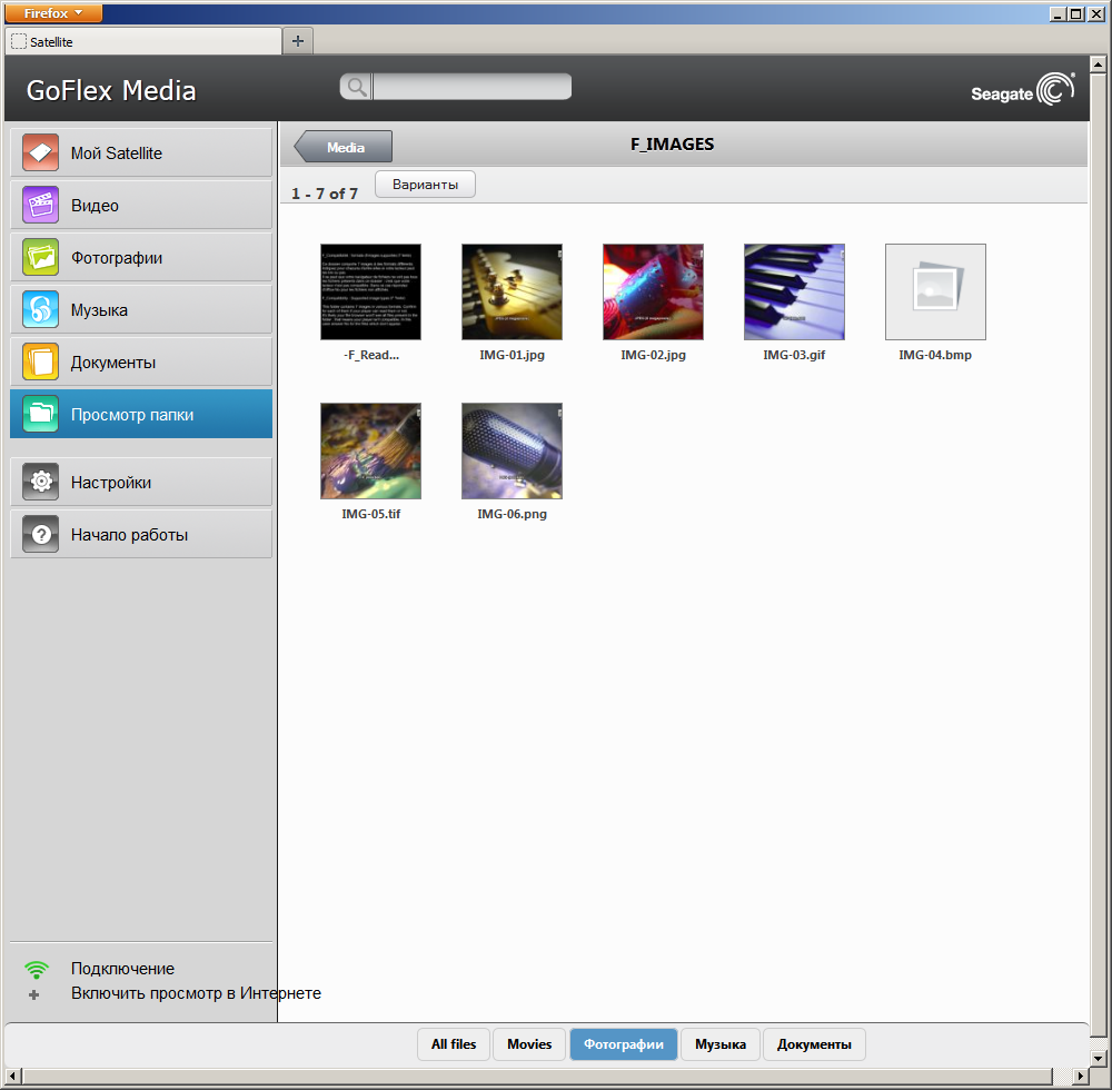 При использовании персонального компьютера или ноутбука достаточно будет открыть любую страницу браузера после подключения к беспроводной сети накопителя, а устройство самостоятельно перенаправит вас на свой web-интерфейс. Для мобильных устройств утилита GoFlex Media предоставляет больше возможностей и удобства. Поддержка аудио- и видеоформатов определяется в основном возможностями программного обеспечения на стороне клиента, в частности браузера на ПК и операционной системы и приложений на мобильном устройстве, хотя собственные фильтры накопителя также могут участвовать в процессе. Эта функциональность используется для выбора типа контента при работе в режиме «Просмотр папки». Под фотографиями устройство понимает JPEG, GIF, BMP, TIF, PNG, музыкой считаются MP3, M4A, WMA, WAV, а видео — AVI, MPEG, MP4, WMV, MOV, MKV. Поддерживаются и некоторые другие, менее распространенные форматы.