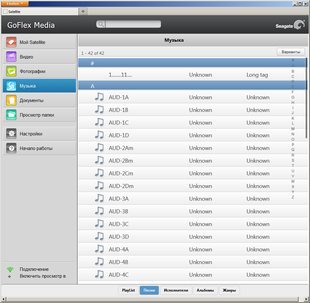 По сути, Seagate GoFlex Satellite представляет собой сетевой накопитель с беспроводным интерфейсом, поддержкой специализированной утилиты управления, встроенной системой индексации файлов и сервером DLNA. Для записи на него документов предусмотрено кабельное подключение устройства к ПК (в этом случае контроль, конечно, полный — можно и удалять документы) или загрузка через браузер в фиксированные папки по типу контента (кроме музыки). А вот вариантов доступа для чтения гораздо больше: на мобильных устройствах Android и iOS можно использовать специализированную программу GoFlex Media, а также на всех (включая и ПК, и мобильные устройства) — web-браузер или DLNA-клиент.
