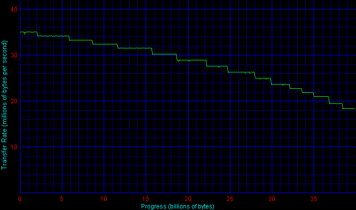 Прежде всего, тут очевидно, что график у в ST9100823A не «отягощен» заботой о «ровных полках»: его «шероховатости», конечно, нельзя приписать различным «адаптивным форматированиям» (да и нет их тут как класса). Поэтому спишем это на легкий дефект конкретного экземпляра диска (кстати, график у его предшественника был куда более гладким) и далее закроем на это глаза, поскольку, на самом деле, его вклад в производительность диска пренебрежимо мал, да и у коллег из тестовых лабораторий других изданий этот график получался не намного «чище».