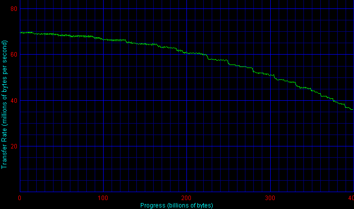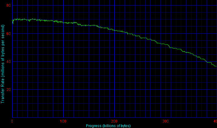 Можно видеть, что график для диска ST3400832NS серии NL35 заметно отличается от такового для Барракуды ST3400832AS с прошивкой версии 3.01, однако он поразительно похож на график такой же Баракуды ST3400832AS с прошивкой 3.02. Отличие от последнего заключается только в том, что в первой зоне (первые примерно 100 Гбайт) у NL35 скорость уверенно достигает своего максимума, а у Барракуды этот участок сильно «зашумлен» и явно недобирает в средней скорости. Тогда как по остальным зонам наблюдается практически полное совпадение (лишь самый хвостик графика в конце дисков немного различен). Таким образом, можно заключить, что NL35 действительно повторяет характеристики Barracuda 7200.8, но делает это «более уверенно», с лучшей надежностью что ли. Вместе с тем, раннее поколение этих Барракуд отличается немного меньшей скоростью линейного чтения, что видно из графиков.