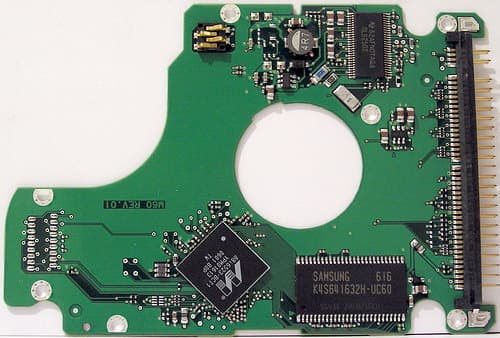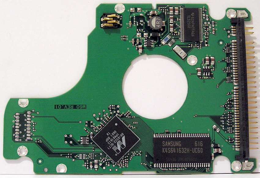 Печатные платы двух моделей с разными интерфейсами сходны по форме и компоновке, хотя и различаются применяемой элементной базой и разводкой. Различие касается, прежде всего, используемого микроконтроллера, хотя помимо этого на плате SATA-диска присутствуют также некоторые другие элементы, отсутствующие на PATA-контроллере. Например, импульсный преобразователь питания и др. Кстати, печатные платы у контроллеров таких дисков очень тонкие — всего 0,6 мм в толщину (с маской), хотя при этом и многослойные — как минимум, три слоя металлизации. А между платой и корпусом есть мягкая изолирующая прокладка. Колодка электроконтактов, к сожалению, игольчатая, хотя для сигналов шпиндельного мотора используются 3 (а не 4, как бывает чаще) прижимные позолоченные лапки.
