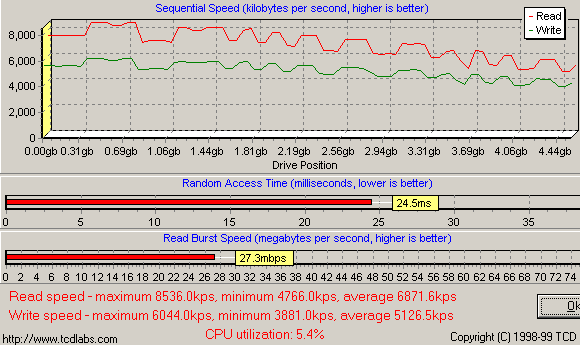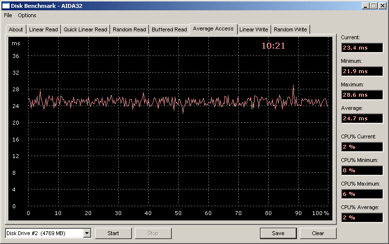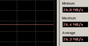 По результатам тестов мы имеем среднее время доступа к диску (при чтении) около 24,7 мс (примерно одинаково для HD Tach, AIDA32 и WinBench 99) и скорость работы USB-интерфейса диска — около 27 Мбайт/с (с некоторыми другими внешними USB-накопителями эта материнская плата демонстрировала лучшую скорость — до 34 Мбайт/с).