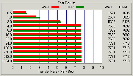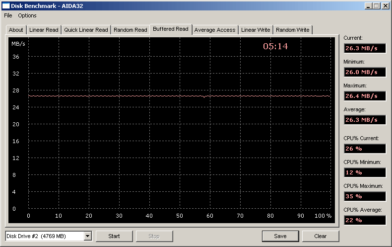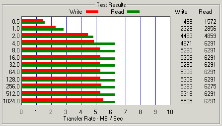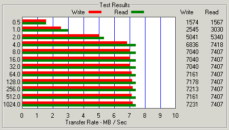 Диск подключался к порту USB 2.0 материнской платы (контроллер в южном мосте ICH5R) и тестировался под Windows XP Professional разбитым на один раздел максимальной емкости (4769 Мбайт), отформатированным под FAT32.