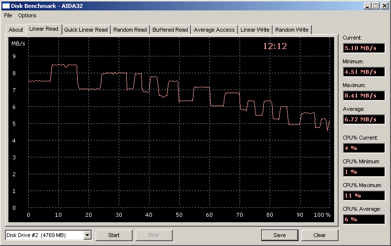 Графики скорости линейного чтения и записи в программе AIDA32 закономерно совпадают друг с другом и совпадают с таковыми для WinBench 99 (а HD Tach при записи выдает неправильные значения). В целом видно, что жесткий диск использует технологию так называемого «адаптивного форматирования» (если выражаться терминологией IBM/Hitachi, впервые применившей подобный подход в своих мобильных жестких дисках) — каждая сторона магнитной пластины отформатирована со своей собственной плотностью записи и очевидно, что эта плотность записи (по крайней мере, вдоль треков) заметно различается для двух сторон диска. Максимальная скорость линейного чтения/записи для испытанного здесь экземпляра диска составляет около 8,7 млн. байт/с, а средняя по диску равна 6,8 млн. байт/с (по WinBench 99), что заметно меньше, чем у самых современных флэш-драйвов с интерфейсом USB 2.0.
