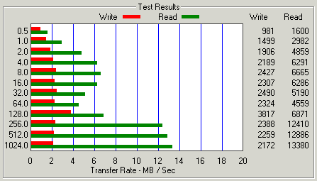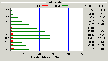 По результатам этого теста можно заключить, что мелкие файлы (размером меньше 1 Мбайт) относительно неплохо кэшируются диском при чтении (причем файлы размером вплоть до 128 Кбайт кэшируются лучше всего), но кэширование при записи для них — очень посредственное. Вообще, запись мелких файлов и, особенно, мелкими блоками — слабое место этого накопителя. Впрочем, если рассматривать его как устройство, с которого можно воспроизводить видео или аудио и просматривать архивы файлов и изображений (это все операции чтения), то тут с диском все в порядке.