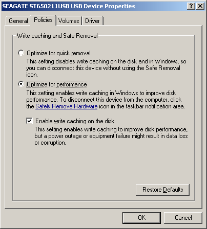 Однако далее начинаются сюрпризы: 10000 мелких файлов размером по 50 кбайт (характерных, например, для небольших web-фотографий, небольших документов и пр.) копируются внутри диска со скоростью… 130 Кбайт/с, что отнимает больше часа! Дальше — хуже: 50000 очень мелких файлов размером по 1 кбайт каждый (характерны для элементов оформления web-страниц и некоторых специальных приложений) копируются диском со скоростью… 2,6 Убайт/с! Другими словами, за пять с половиной часов! И фактически потери времени на копирование одного (самого мелкого) файла этим диском расходуется 0,4 секунды. Вывод очевиден — для записи/чтения/копирования большого количества файлов (более 1000) этот накопитель мало пригоден, поскольку много времени расходуется на работу собственно с оглавлением (каталогом) логического диска (тома). Немного улучшить ситуацию могло бы помочь (и в случае более «крупных» USB-дисков не раз помогало) включение кэширования Windows для мобильных дисков: