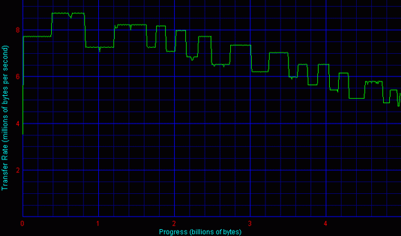 Скорость копирования крупного (AVI, 500 Мбайт) файла внутри самого накопителя составила 2,4 Мбайт/с (поделив это поровну между чтением и записью, получим примерно 5 Мбайт/с для каждой из этих операций), что относительно хорошо. Если перейти на копирование более мелких файлов — по 5 Мбайт (типичных для MP3, архивов, небольших дистрибутивов и пр.), то скорость копирования немного падает — до 1,8 Мбайт/с (в среднем по 3,6 Мбайт/с на чтение и на запись).