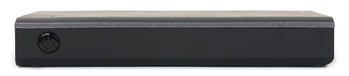 На правом длинном торце устройства установлен круглый разъем для подключения зарядного устройства. На левом можно увидеть утопленную кнопку включения питания в автономном режиме.