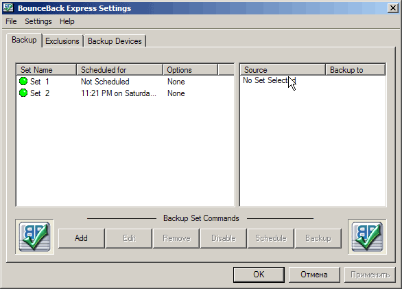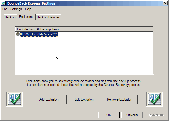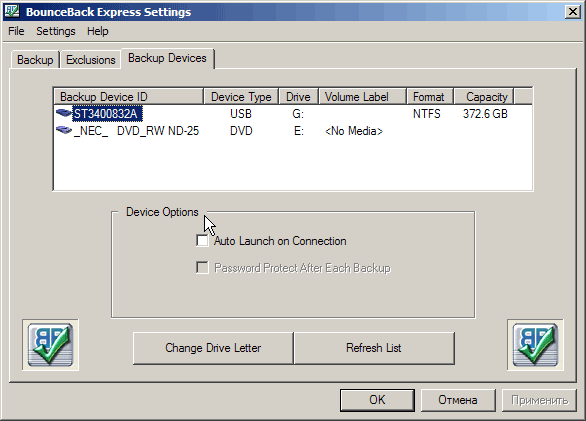 На вкладке Exclusions мы имеем возможность исключить из резервирования — увы, только папкудиск целиком, либо файлы поштучно — использование масок не предусмотрено. На вкладке Backup Devices мы видим пригодные (по мнению BounceBack Express) устройства в системе для осуществления резервного копирования. Ничего кроме смены буквы дисковода мы здесь сделать не можем.