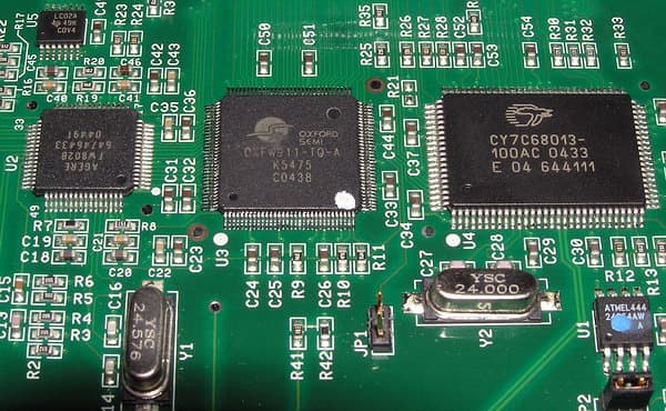 Все компоненты на четырехслойной плате компактно расположены с одной стороны (при монтаже эта часть «смотрит» в сторону платы контроллера самого диска, но отделена от нее внушительной металлической пластиной-экраном). За USB-порт отвечает популярный контроллер CY7C68013, за FireWire — чип Agere FW802B, а IDE-канал обслуживается не менее популярным среди создателей внешних накопителей контроллером OXFW911-TQ-A от Oxford Semiconductor, который служит мостом между шинами IDE и FireWire.