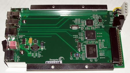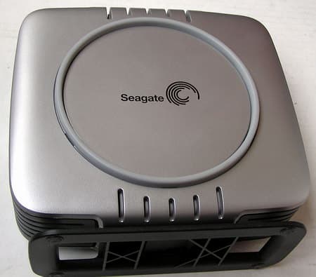 Сама по себе плата электроники внешнего накопителя Seagate, конечно, в несколько раз больше, чем, например, у аналогичного изделия от Maxtor, но за счет расположения «под диском» такой конструкции удается быть более компактной в конечном итоге — корпус накопителя Seagate занимает меньше места на столе и куда более легкий. Впрочем, массивный металлический корпус от Maxtor у меня лично вызывает больше уважения, хотя в портфеле носить не очень-то хочется — больно тяжел. К тому же, корпус Seagate по всему периметру имеет вентиляционные отверстия, чего нет у Maxtor, который, как правило, вынужден использовать активное охлаждение — вентилятором через узкие торцевые прорези.