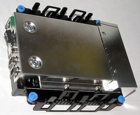 В первый раз вскрыть корпус внешнего накопителя Seagate — задача не из простых (в отличие, например, от внешних дисков Maxtor, где эта процедура производится одной левой). Сначала нужно снять верхнюю (то есть ту, которая без резинового обода-подставки) серебристую пластиковую крышку, ослабив фиксаторы-защелки через три паза в боковой части корпуса (над панелью с разъемами) и затем, сместив крышку в сторону разъемов. После этого следует вооружиться пятиконечной (!) отверткой с полостью по центру жала и снять нижнюю серебристую крышку. И следом вынуть центральный металлический каркас,