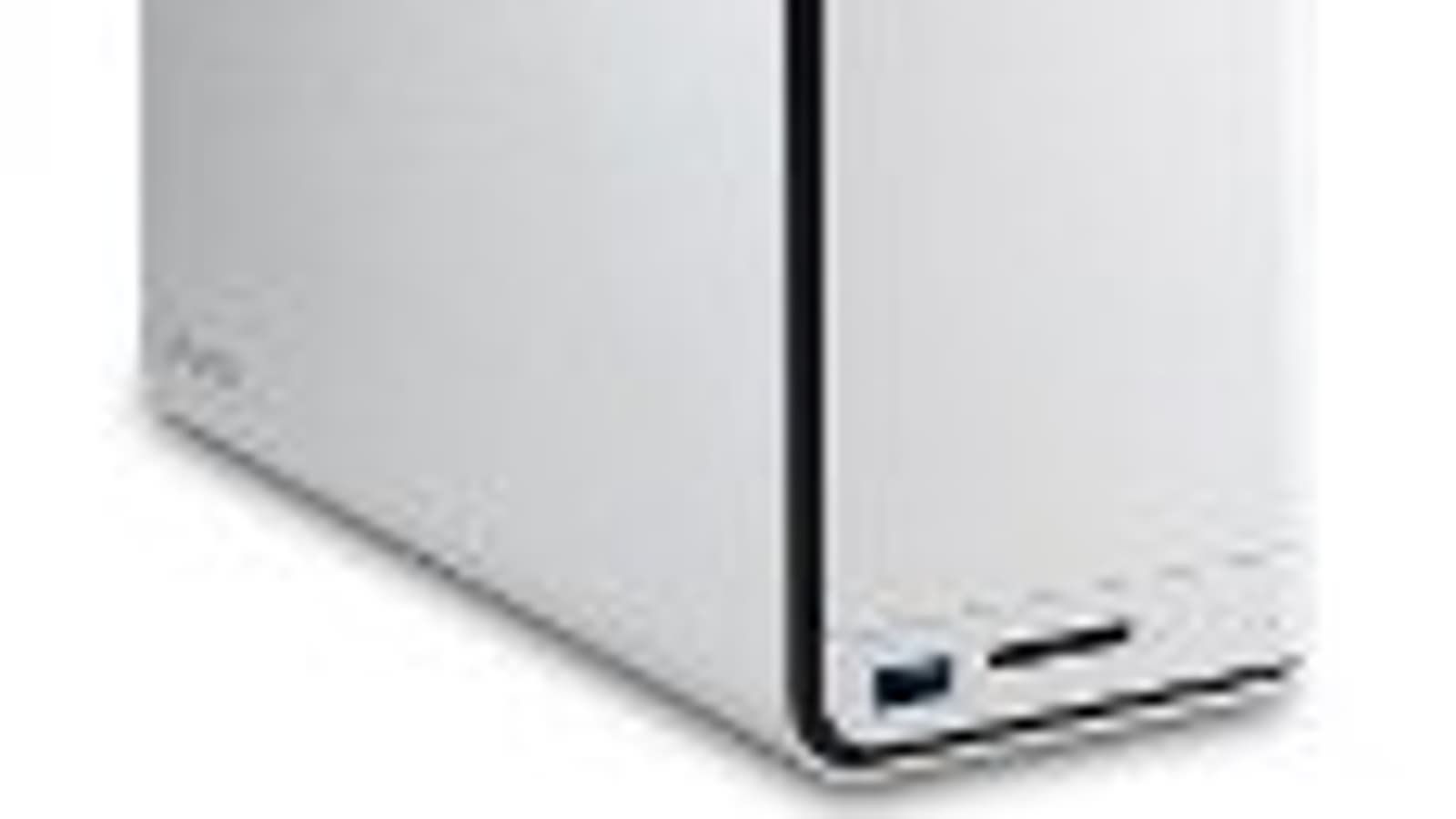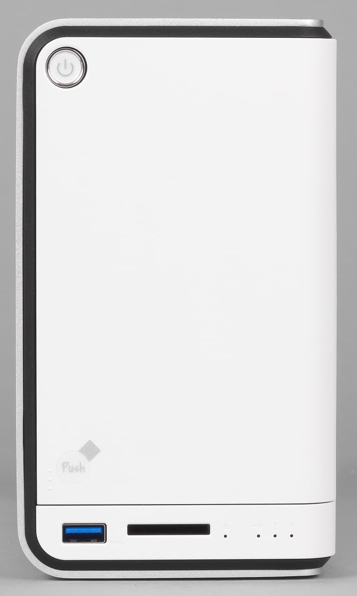 Лицевая панель служит также крышкой дискового отсека. В ее верхнем левом углу находится кнопка включения устройства со встроенным многоцветным индикатором питания/статуса. В нижней части можно заметить порт USB 3.0, слот для карт памяти SDHC и четыре светодиода — два для отображения статуса этих портов и два для дисков.