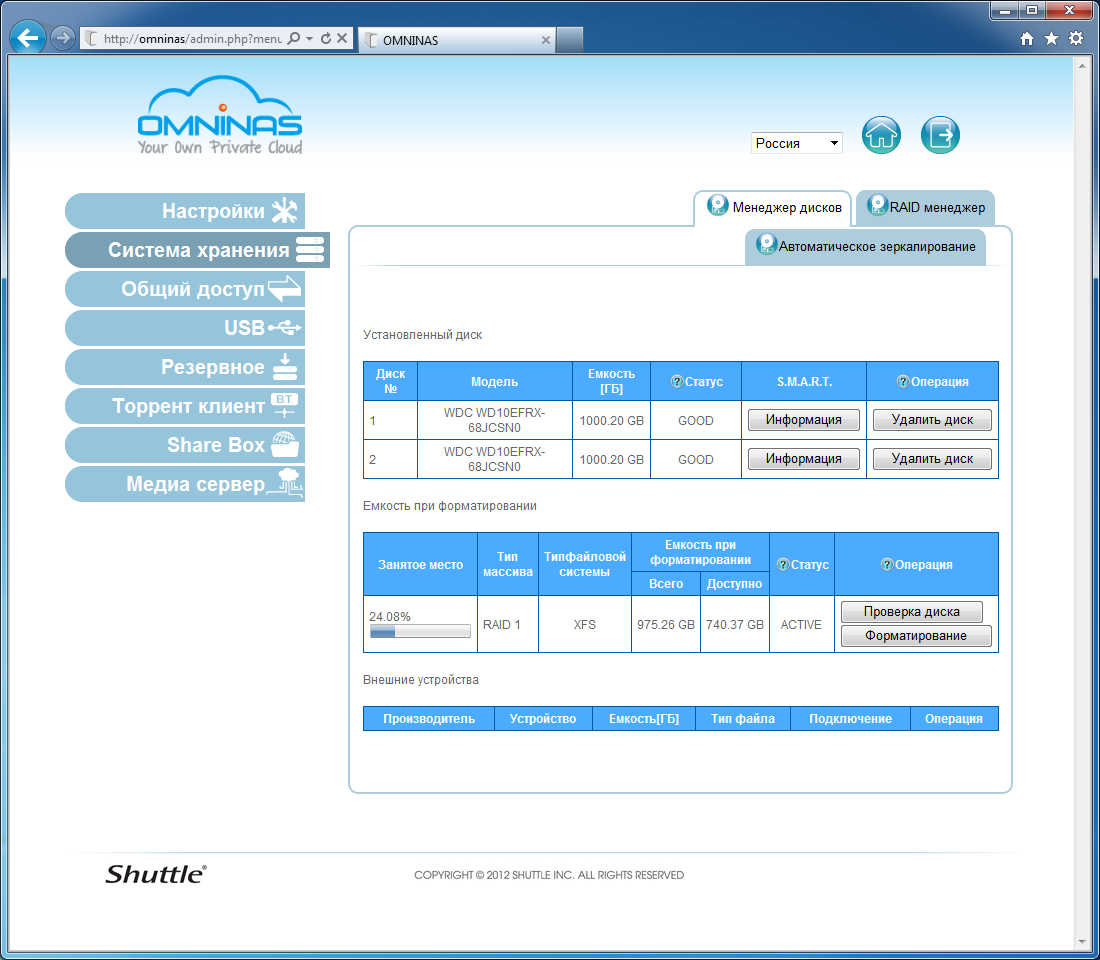 На отдельной странице можно узнать состояние S.M.A.R.T. винчестеров (в тестируемой версии прошивки функция не работала), проверить или отформатировать дисковый массив. Отметим, что накопитель использует формат GPT, а раздел с данными форматируется в файловую систему XFS.