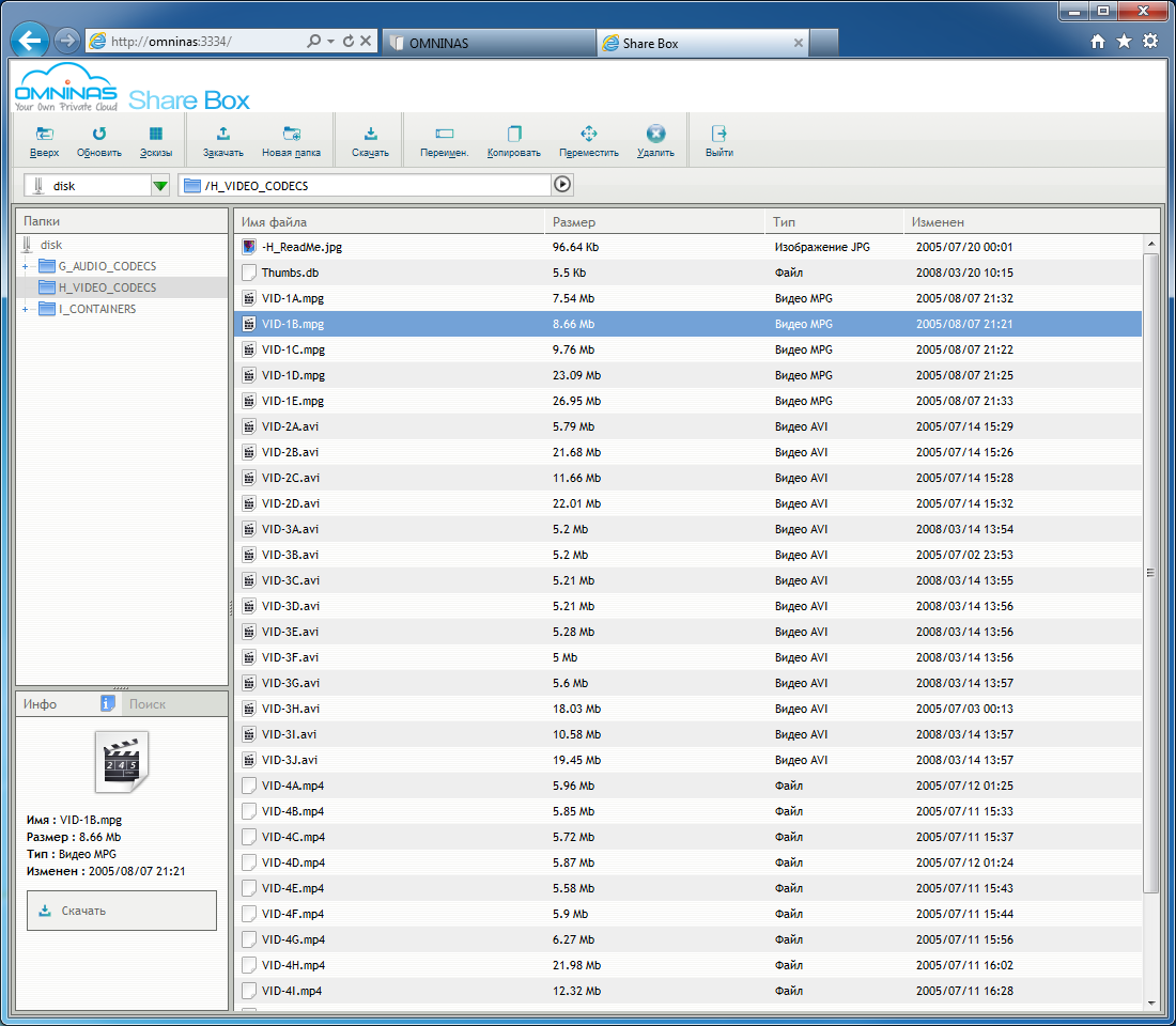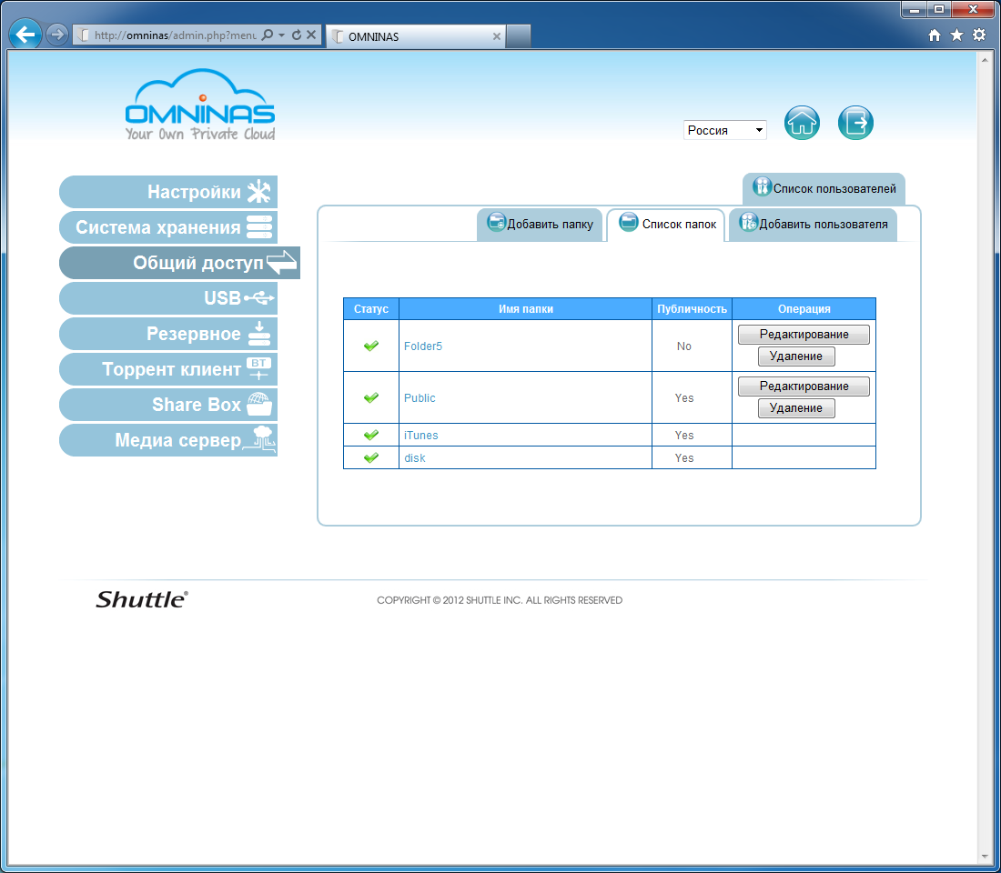 Современные накопители нельзя представить без возможности удаленного доступа к данным. Не стал исключением и Shuttle Omninas KD20. В нем реализован сервис Share Box, который представляет собой файловый менеджер AjaXplorer, дополненный собственным клиентом DDNS, редиректом по имени системы с сайта http://www.omninas.net и автоматической трансляцией порта через UPnP-совместимый роутер. При этом проводится контроль прав доступа пользователя для доступа к ресурсам. Отметим, что этот сервис можно использовать и в локальной сети для управления файлами. Поддерживаются все актуальные операции с папками и документами.
