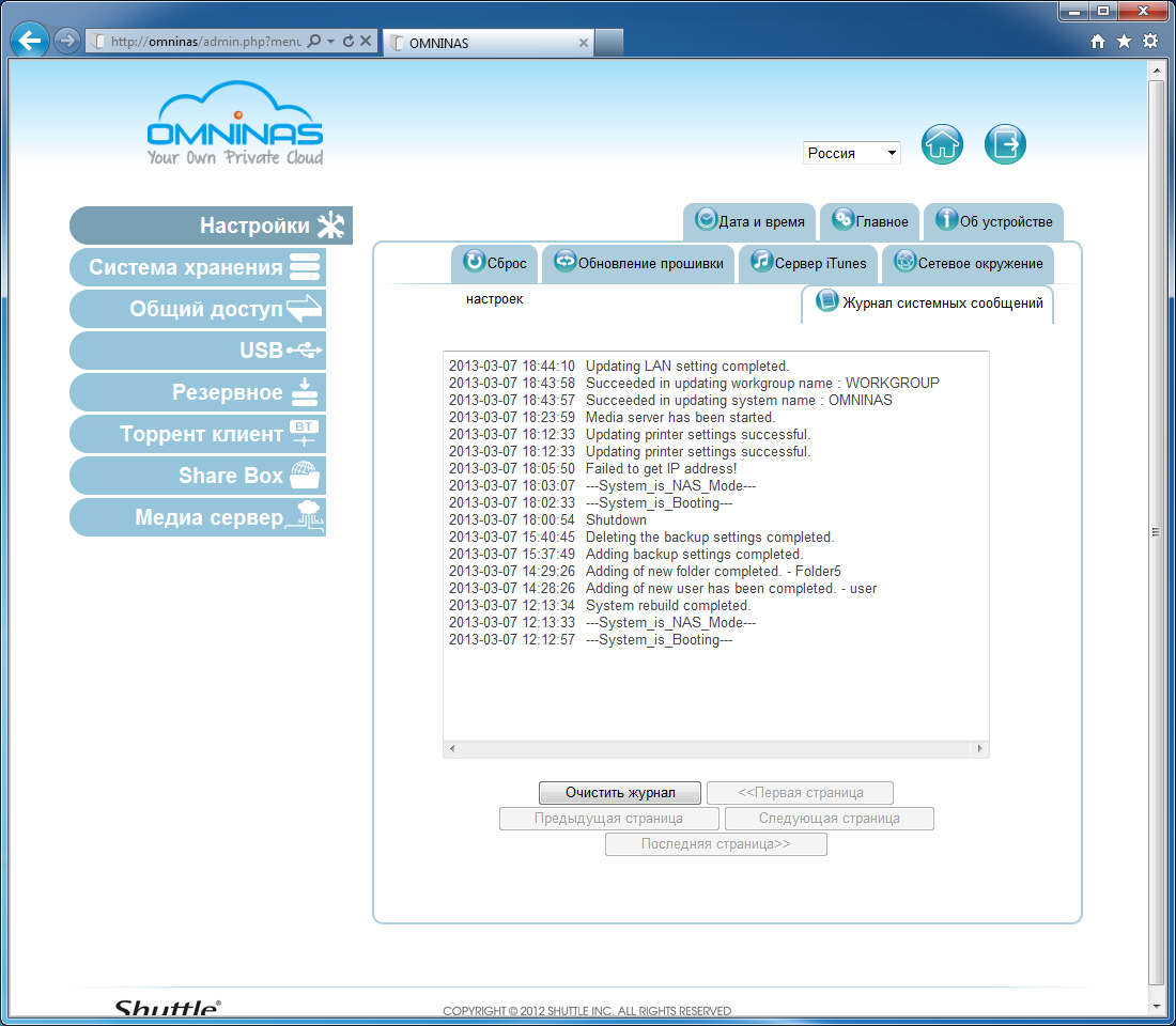 Выбор системных настроек также вполне обычен для данного класса устройств: обновление прошивки из файла, сброс настроек, установка даты и времени (в том числе с синхронизацией через интернет, это в некоторой степени компенсирует отсутствие батарейки в устройстве), изменение пароля администратора. На специальной странице статуса можно просмотреть основные параметры устройства, включая сетевые адреса, версию прошивки, активные сетевые протоколы. Журнал системных сообщений только один, и достаточно скромный по своему наполнению. Из управления питанием есть только опция выключения винчестеров после указанного интервала бездействия.