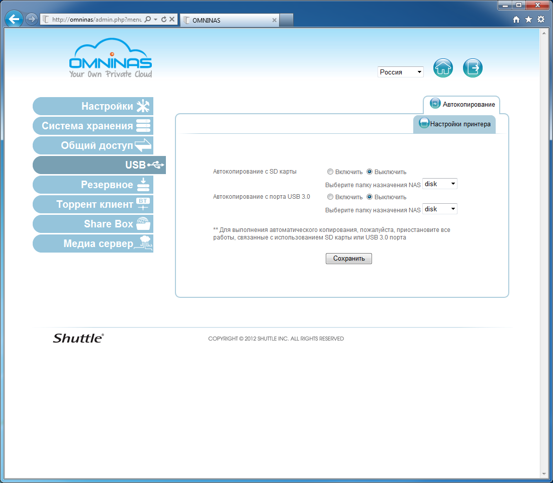 Подключаемые диски становятся доступны по сети всем пользователям. Изменить эти права нельзя. Можно использовать несколько разделов, поддерживаются файловые системы FAT32, NTFS, EXT2/3/4. Правда, мы столкнулись с не совсем корректной работой этой функции — не всегда правильно отображался тип файловой системы в web-интерфейсе, а форматирование диска встроенными средствами может не дать правильного результата. Предусмотрена опция автоматического копирования для переписывания данных с фронтального порта USB и карты памяти в выбранную директорию сетевого накопителя при подключении устройств.