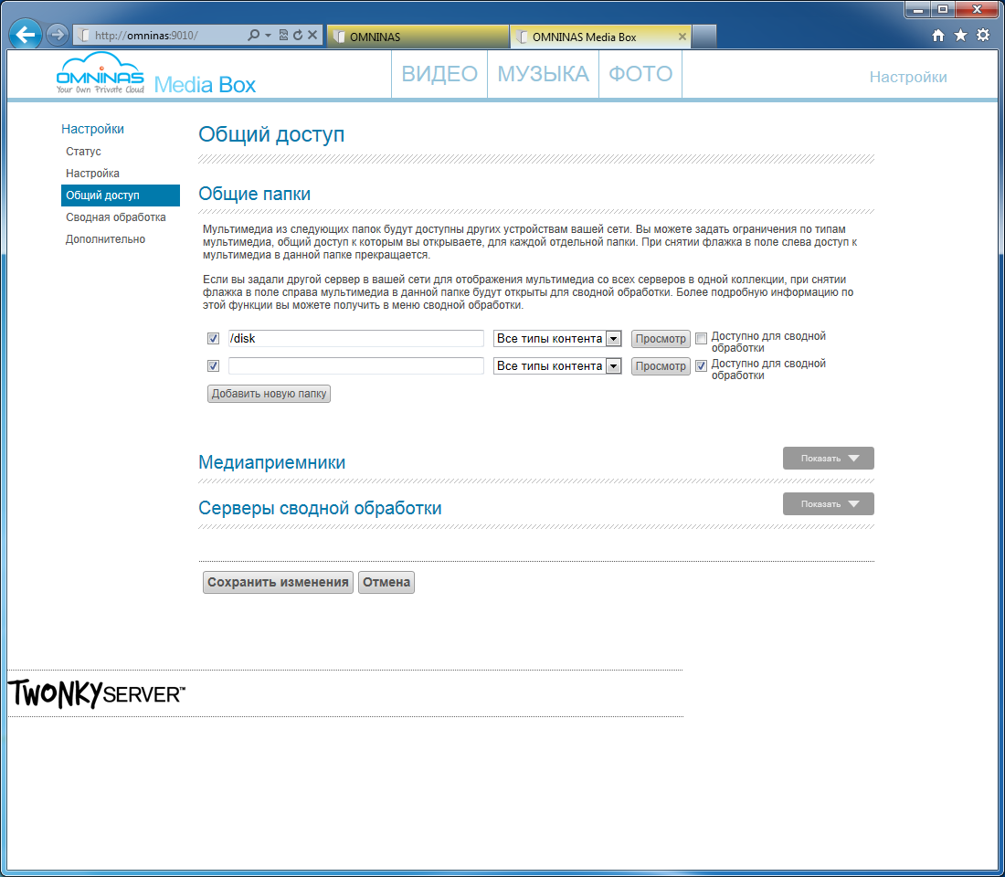 Второй сервер представлен известным решением TwonkyMedia, страница собственных настроек которого также доступна пользователю. Так что при необходимости можно добавить к директории по умолчанию и новые папки для сканирования. Напомним, что в Twonky встроена система просмотра мультимедиа через браузер. Она будет доступна со всех ПК локальной сети без ограничения доступа. Сервером поддерживаются все популярные форматы медиафайлов, включая JPEG, BMP, PNG, MP3, WMA, M4A, WAV, AVI, MPEG, MKV, MP4, M2TS, MOV, TS, WMV.