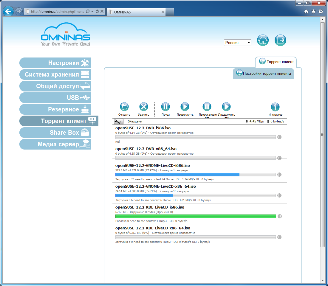 Торрент-клиент реализован популярной утилитой transmission, причем она тоже имеет открытый web-интерфейс и для управления можно использовать сторонние программы на ПК. Через основной интерфейс можно только указать расписание работы клиента, остальные опции доступны в самом transmission. К сожалению, их не так уж и много: ограничения скоростей, порт клиента, рейтинг для раздачи. В частности, число одновременно активных загрузок ограничено в недоступном внутреннем файле конфигурации тремя. Если говорить о скорости, то с популярными раздачами она может составлять несколько мегабайт в секунду.