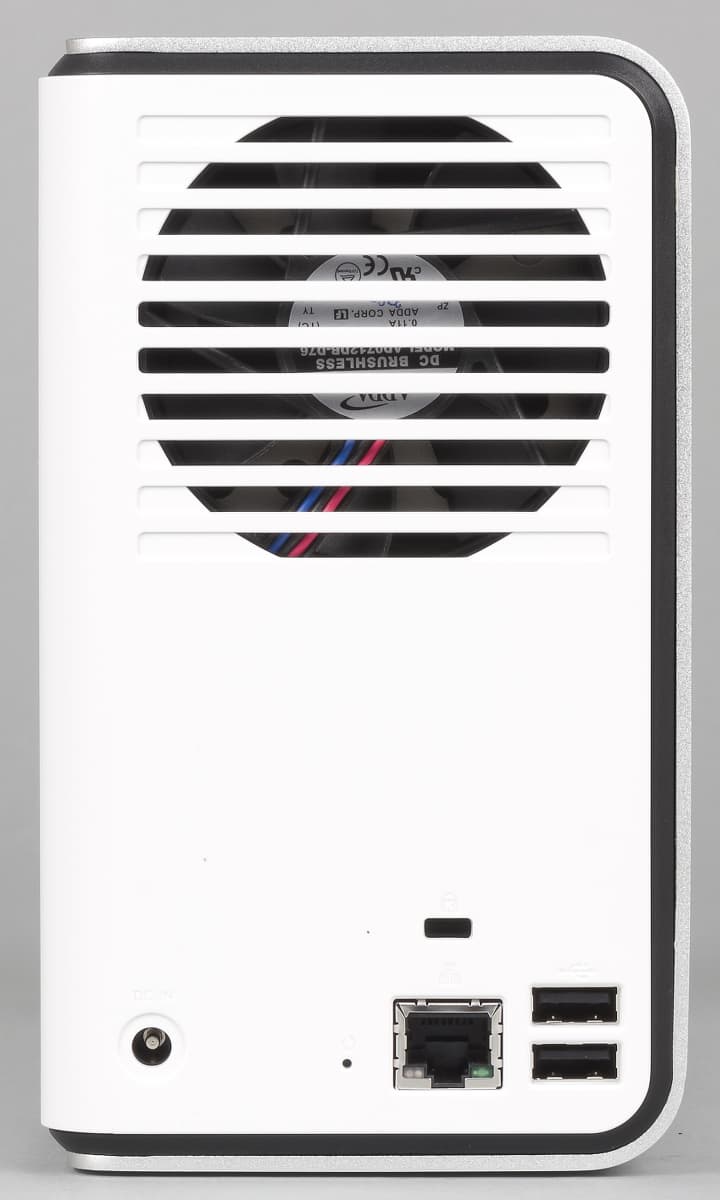 Сзади традиционно находится решетка вентилятора системы охлаждения и основные разъемы: вход блока питания, гигабитный сетевой порт с индикаторами скорости и активности, два порта USB 2.0. Также здесь есть скрытая кнопка сброса и отверстие для кенсингтонского замка. Поступление воздуха для вентиляции обеспечивается решеткой в нижней части правой боковой панели. Опирается корпус на невысокие резиновые ножки.