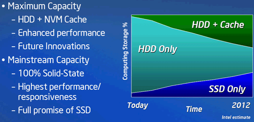 Выше речь шла о сегменте винчестеров на пластинах диаметром 3.5" — на рынке более компактных устройств все будет еще веселее. Они не могут похвастаться емкостью в терабайтах, они имеют более высокую удельную стоимость, они демонстрируют куда более слабую производительность — отличная мишень для SSD-накопителей. Разумеется, после снижения цены: если переход на SSD повысит цену ноутбука премиум-класса с 2000 до 2500 долларов, это будет, все же, сильно заметно, а если до 2200, то уже не так и страшно ;) Для этого как раз и нужно указанное выше — накопитель на 160 ГБ должен подешеветь долларов до 350. После этого самые тонкие и легкие ноутбуки перейдут на SSD, а более крупные их собратья, очень может быть, освоят «гибридную» схему: SSD небольшого объема для системных нужд и HDD гигабайт на 500 для хранения данных. Места для хранения данных будет в этом случае даже чуть больше, чем если ограничиться одним лишь винчестером, скорость работы окажется в разы более высокой, а энергопотребление даже снизится сравнительно с единственным HDD «для всего», поскольку большую часть времени он будет проводить в режиме экономии энергии.