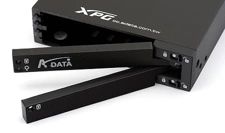 Корзинка от компании A-data этих проблем лишена, да и функциональные ее возможности несколько шире простого переходника. Устройство имеет размеры 148,2 х 101,7 х 25,8 мм и идеально подходит к трехдюймовым отсекам, вмещая при этом два накопителя «ноутбучного» форм-фактора. Стоит отметить, что разъем для подключения питания в данном случае один, т.е. и путаницу кабелей внутри системного блока можно уменьшить.