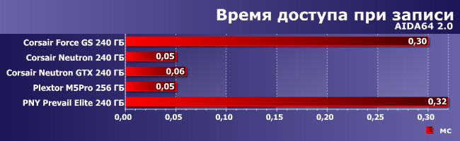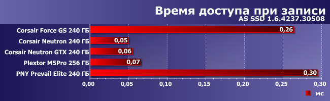 Всех разгромил Neutron — даже по сравнению с формально старшей модификацией выигрыш заметен, да и M5Pro лишь на ее уровне. Накопители на SandForce самые медленные, причем если Force GS держится на общем уровне (он лишь чуть медленнее GT), то SSD от PNY — явный аутсайдер: все-таки большое количество чипов не всегда благо.