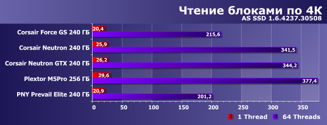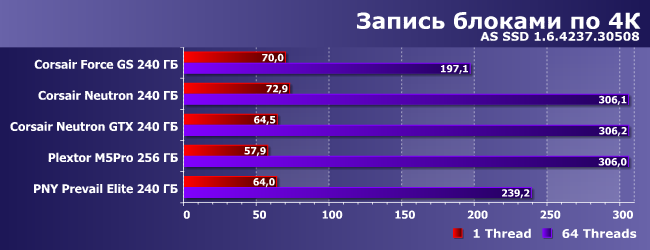 При записи в многопоточном режиме — тем более: тут его может спасти только сжатие, а если оно невозможно, то нечего. Но списывать «старичка» со счетов, все же, не стоит — как видим, в однопоточном он очень даже неплох. Важно ли это? С учетом того, что домашний компьютер — вовсе не файл-сервер, пренебрегать этими результатами не стоит. Пусть они маленькие и некрасивые на фоне огромных цифр наиболее удачной для твердотельных накопителей нагрузок — тесты тестами, а реальная жизнь важнее. И с этой точки зрения, кстати, наиболее пикантным является то, что благородный Neutron GTX отстает от плебейского Neutron — нарочно не придумаешь.