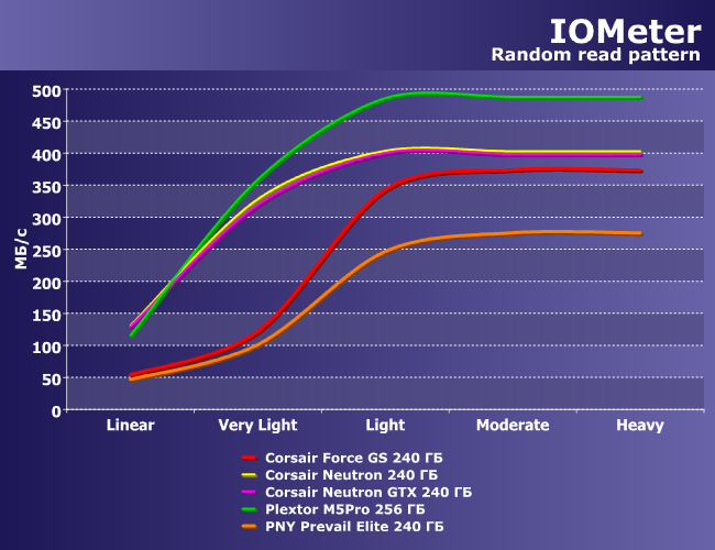 На шаблоне записи SF-2281 очень помогает хорошая сжимаемость данных, так что он может развернуться в полную силу. Причем, поскольку эти результаты обусловлены именно контроллером, нет ничего удивительного в том, что два накопителя на нем становятся очень похожими, но не идентичными. Neutron же одинаковы, а M5Pro схож по поведению с ними, где-то отставая, где-то обгоняя.