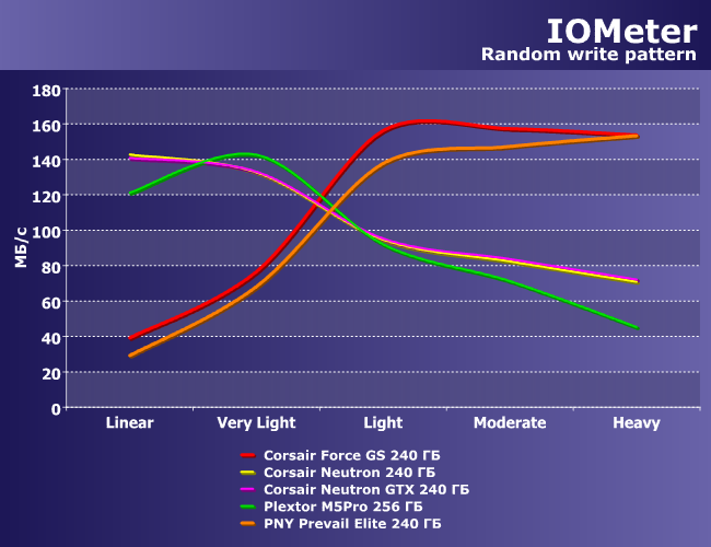 Блоки по 4К несколько менее удобны (к счастью, и менее актуальны) для современных накопителей, нежели традиционно используемые нами в IOMeter 8K, так что тут никакими 500 МБ/с и не пахнет. Впрочем, как в анекдоте про похороны преферансиста — и двух хватило, т. е. достаточно лишь сравнить 340-370 МБ/с с традиционной парой сотен SandForce. Да что далеко ходить — накопители на «старом» Marvell, некогда лидировавшие в этом тесте, выдавали лишь порядка 270-280 МБ/с, что не идет ни в какое сравнение ни с Neutron, ни, тем более, M5Pro. А SandForce, как мы уже сказали, даже силами лучших моделей, еще медленнее. В общем, звезда этого некогда популярного контроллера в сегменте SSD максимальной производительности закатилась окончательно и бесповоротно.