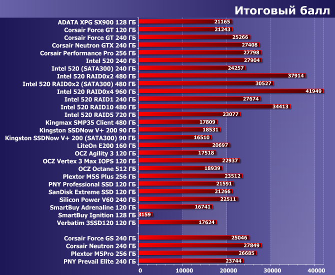 Жаль, что стоимость SSD падает быстро, но не настолько быстро, как хотелось бы — как видим, они интересны не только в качестве системных дисков, а и для работы с большими массивами данных. Во всяком случае, хорошо видно, что одиночный SSD на операциях чтения примерно эквивалентен RAID0 из трех быстрых настольных винчестеров. Если надо быстро считать один большой файл, конечно — на 32 файлах и сравнивать-то нечего.