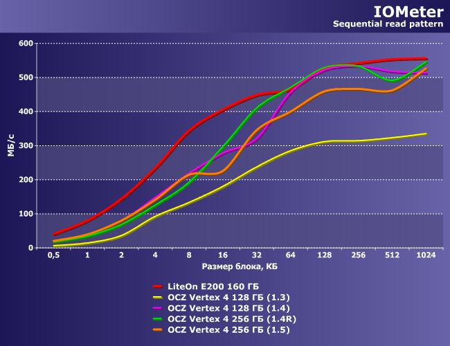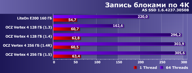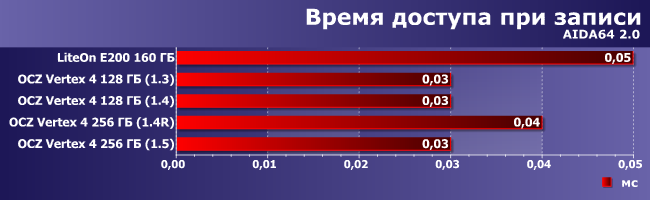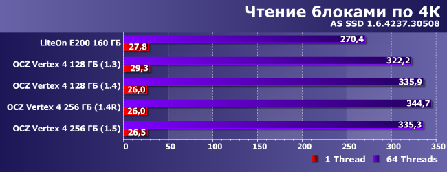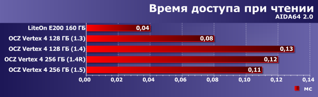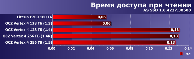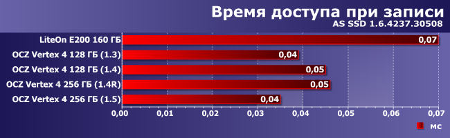 На операциях чтения лидирует SSD LiteOn, а вот внутримодельного ряда, как видим, самой быстрой была прошивка версии 1.3. Впрочем, ничего удивительного — основные улучшения последующих версий официально касались производительности последовательных операций, а в этом мире ничего бесплатно не дается :) Но в 1.5 негативный эффект удалось уменьшить.