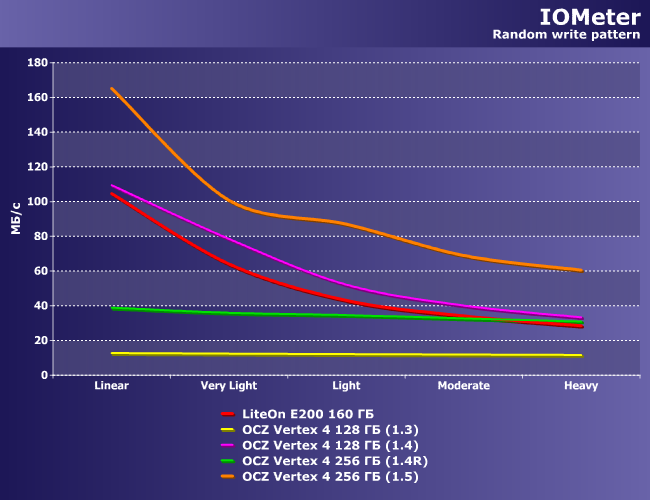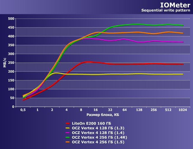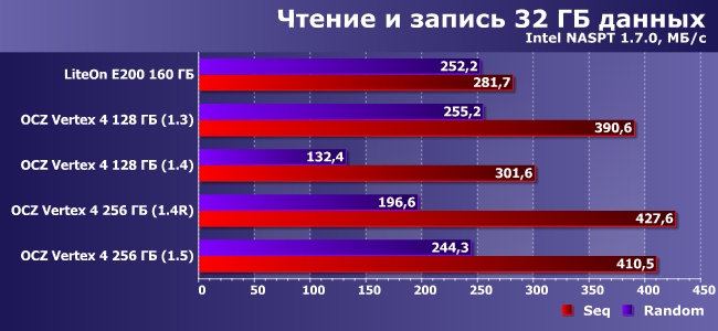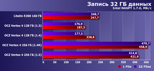 Лидерство LiteOn понятно. В остальном же, как видим, 1.3 свои преимущества под нагрузкой сохранить не могла, т.е. переход на версию 1.4 более чем оправдан. Но и 1.5 при «тяжелых» нагрузках медленнее, чем 1.4! Настолько медленнее, что модификация на 128 ГБ с более старой прошивкой оказалась быстрее 256 ГБ с более новой.