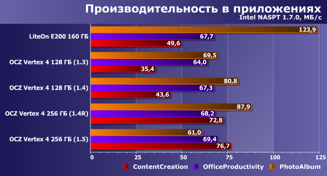 Хорошо видно — зачем вся возня с прошивками (а выходили они с крайне небольшими интервалами) затевалась: Vertex 4 128 ГБ с 1.3 явный аутсайдер, а вот с перехода на 1.4 результаты радикально повысились. Впрочем, вот здесь уже свежая 1.5 дает некоторое падение показателей.