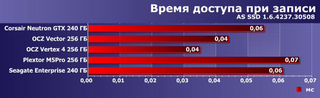 Что еще более примечательно, и здесь Vector уверенно встроился в ряды лидеров. Точнее, на операциях чтения он лишь немного отстал от Plextor M5 Pro, а при записи по мере роста нагрузки вообще вышел на первое место. Seagate же, напротив, на операциях чтения разделил последнее место с Vertex 4, да и при записи рекордов не поставил, но в этом нет ничего страшного: его производительность вполне отвечает топовому уровню, просто таких уж мы серьезных конкурентов ему предоставили.