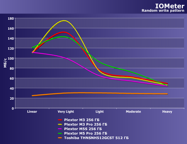 Наиболее любопытным здесь выглядит поведение четверки Plextor. M5 Pro, снабженный и быстрой памятью, и «свежим» контроллером лидирует, однако на блоках небольшого размера с ним вровень идут оба представителя линейки M3. Однако по мере роста нагрузки на первое место явно выходит контроллер, а он в этой серии тот же, что и в М5, так что тут уже эта тройка одинакова. Несмотря на то, что в «обычном» М5 компания пошла на использование более дешевой флэш-памяти — как видим, положение дел от этого не слишком ухудшилось. Ну а Toshiba — явный аутсайдер.